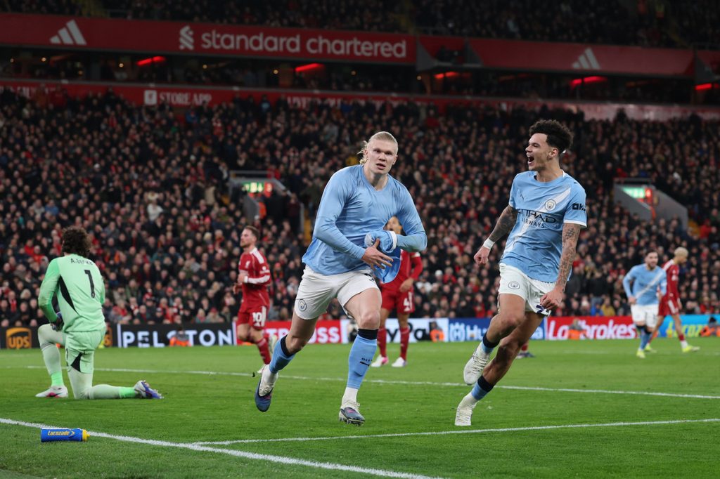 Foi com emoção até o último minuto, mas o Manchester City manteve viva a perseguição ao Arsenal pela liderança do Campeonato Inglês. Diante do Liverpool, em Anfield Road, o time de Pep Guardiola saiu atrás, mas mostrou brio e foi buscar a virada com um gol de pênalti de Haaland nos instantes finais: 2 a 1.Veja TambémLiverpool x Manchester City, lance a lance