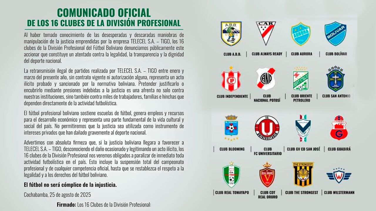 “Advertimos con absoluta firmeza que, si la justicia boliviana llegara a favorecer a TELECEL S.A. – TIGO, desconociendo el daño ocasionado y legitimando un acto ilícito, los 16 clubes de la División Profesional nos veremos obligados a paralizar de inmediato toda actividad futbolística en el país. Esto incluye la suspensión total del campeonato profesional y de cualquier competencia oficial, hasta que se restablezca el respeto a la legalidad y a los derechos del fútbol boliviano”, señala el pronunciamiento.