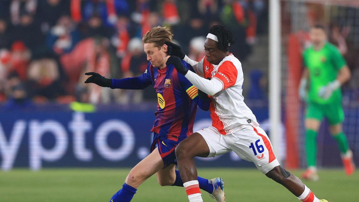 De Jong tampoco estará porque en el tramo final del partido ante el Slavia, en el minuto 87, vio la cartulina amarilla que le obligará a cumplir un partido de sanción por acumulación de amonestaciones. Â