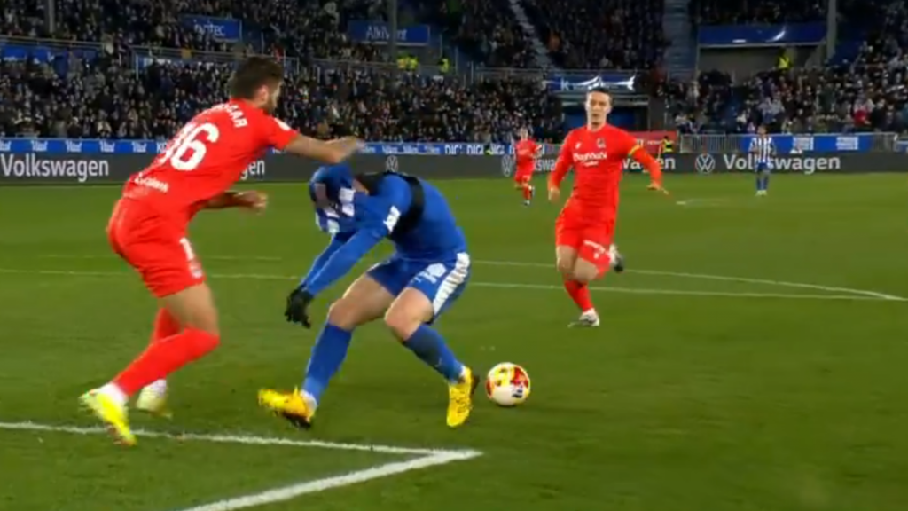 El partido marchaba cuesta arriba para la Real Sociedad, que perdÃa 2-1 en Mendizorroza, cuando en el minuto 61 llegó una de las acciones más surrealistas de toda la temporada. Toni MartÃnez atacó el espacio a la espalda de la defensa txuri urdin y Caleta-Car logró igualar la acción tras el resbalón previo del delantero del Alavés. El central croata llegó a cubrirle bien, pero ya dentro del área se produjo un forcejeo propio de un duelo defensivo, sin entradas agresivas ni zancadillas.