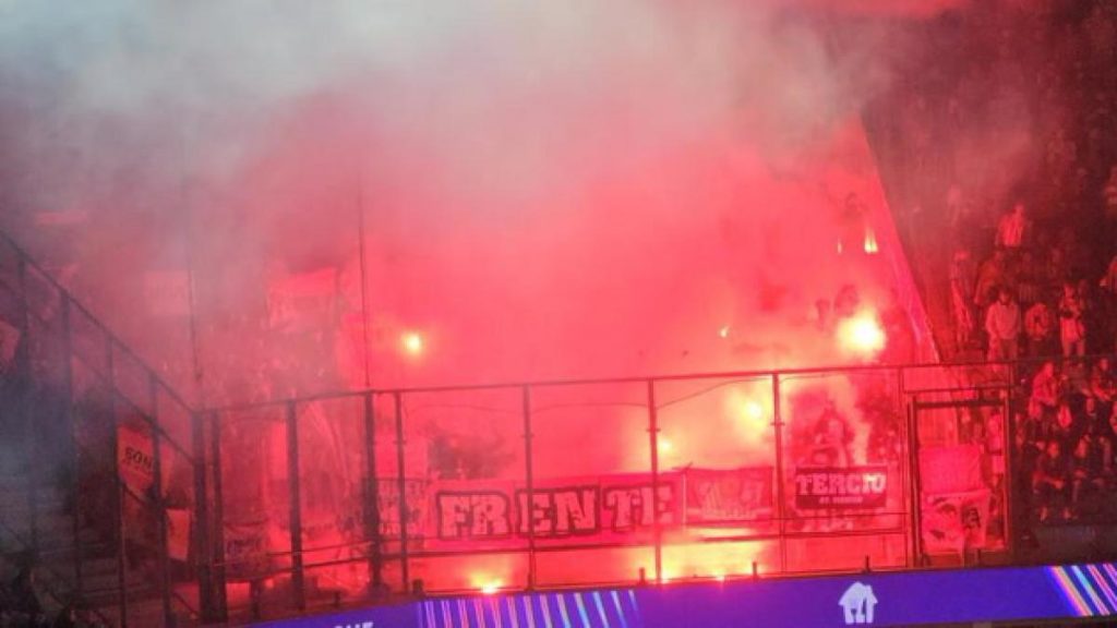 En el tramo inicial del choque, alrededor de siete dispositivos pirotécnicos, bengalas, iluminaban de rojo la grada del Atlético, mientras se generaba una gran humareda.