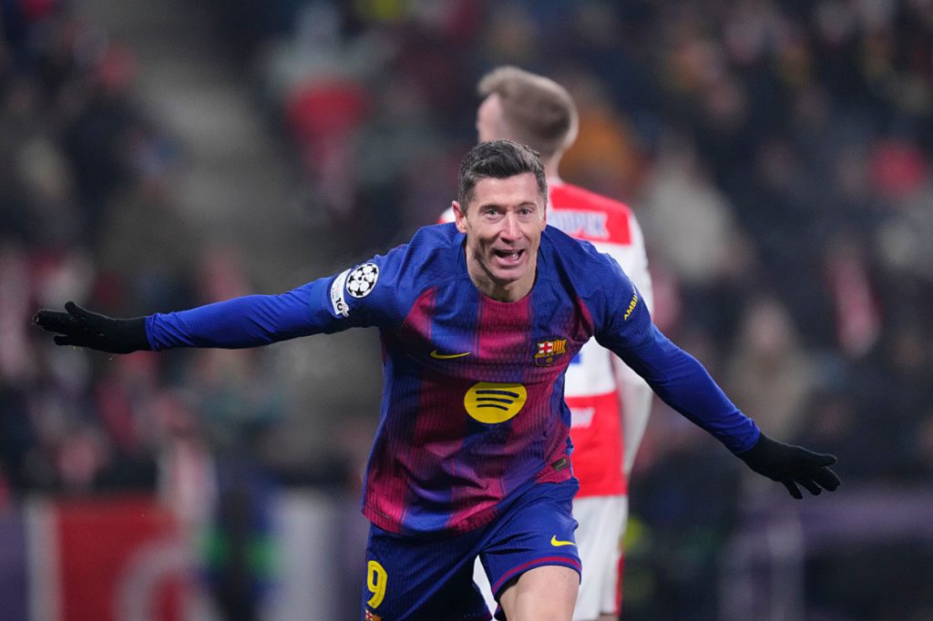 Robert Lewandowski balançou as redes na vitória do Barcelona sobre o Slavia, em Praga, nesta quarta-feira, e igualou feitos de Cristiano Ronaldo, Messi e Neymar na Liga dos Campeões.